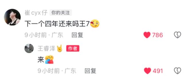 在个人社媒账号下,“社牛”崔永熙问王睿泽下个四年还来不来,王睿泽坚定地回答说“来”。