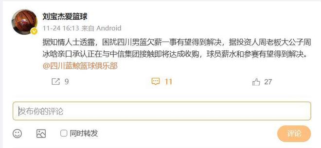 - 根据媒体人刘宝杰老师的消息,四川队和中信集团即将达成收购协议,如果顺利完成并购不仅可以解决球员和教练组的...发表于: 11-26 23:31