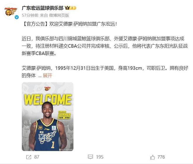就在刚刚,广东宏远队官宣上赛季效力于四川队的小外援,上赛季CBA得分王萨姆纳加盟,目前广东队新赛季的四名外援已经全部到位,球队整体实力较上赛季有了很大的提升,新赛季杜锋和朱芳雨将带领球队冲击队史第12冠。