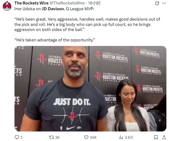 火箭主帅乌度卡的一段 3 分钟采访,让双向合同球员 JD - 戴维森意外成了焦点。“我在凯尔特人带过他,太了解了!决策明智、进攻有侵略性、挡拆判断精准,攻防两端都够狠!” 乌度卡几