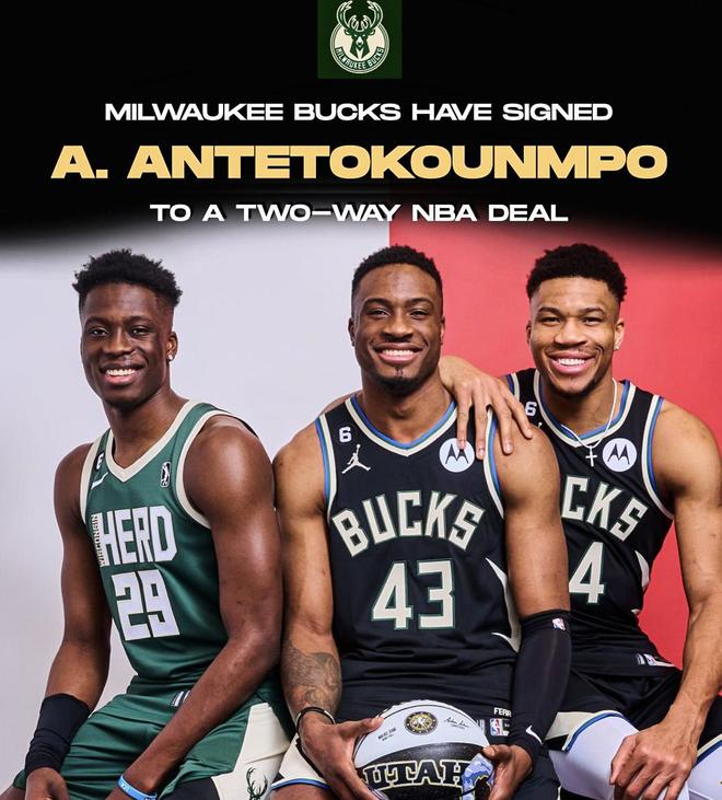 雷速体育10月14日讯 名记Shams今日在社交媒体上,报道了雄鹿与字母哥的弟弟亚历克斯·安特托昆博达成双向合同,他将与两位哥哥扬尼斯和萨纳西斯并肩作战,而字母哥三兄弟也成为