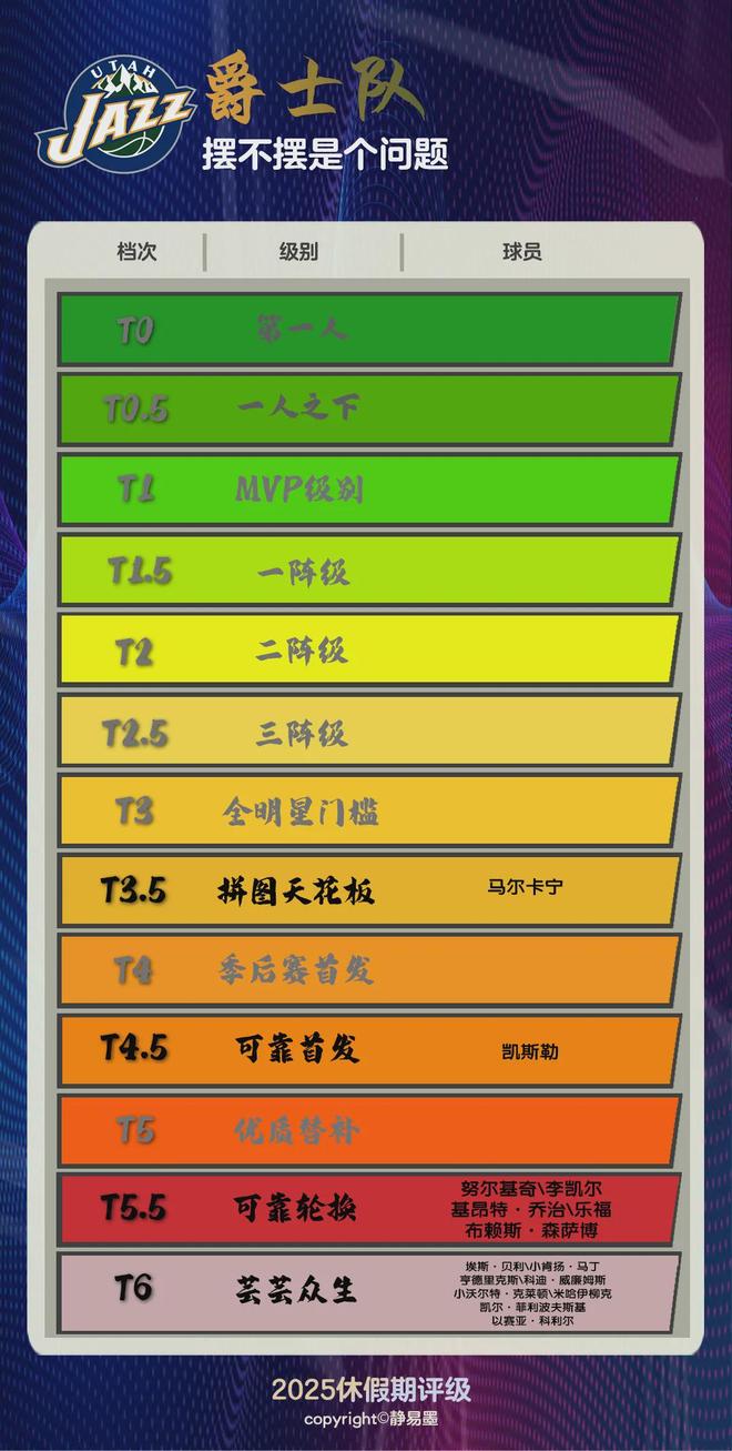 这是4支球队中相对有点谱的。这么讲并不代表爵士的建队进度多顺利,更多是基于对他们队史的尊重。爵士有不靠高顺位选秀孕育出建队核心的案例,还不止一次,这似乎是爵士摆得不够烂的底气。