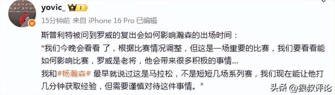 北京时间11月1日,NBA季中赛正式开打,开拓者对阵掘金,赛前,开拓者主帅斯普利特接受媒体采访,提到了罗威复出之后,杨瀚森位置变化等相关话题。