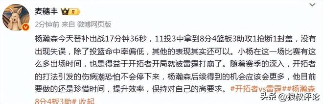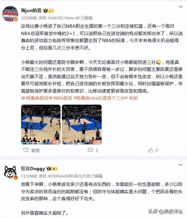 媒体人“海JUN的蓝”发文点评:这场比赛小杨进了自己NBA职业生涯的第一个三分和空接扣篮,还有一个面对NBA总冠军首发中锋的2+1,可以说把自己在进攻端的特点都发挥出来了,所以说瀚森的进攻能力包括传球策应都算达到了NBA的标准,今天本来有很大机会能得分上双,但后面几次三分手感不好。