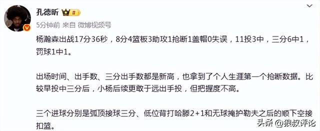 篮球记者“孔德昕”发文点评:“出场时间、出手数、三分出手数都是新高,也拿到了个人生涯第一个抢断数据。比较早投中三分后,小杨后续更敢于远出手投,但把握度不高。