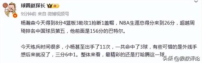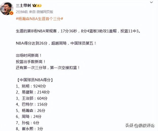 媒体人赵探长发文点评:“杨瀚森今天得到8分4篮板3助攻1抢断1盖帽,NBA生涯总得分来到26分,超越周琦排名中国球员第五,他前面是156分的巴特尔。”