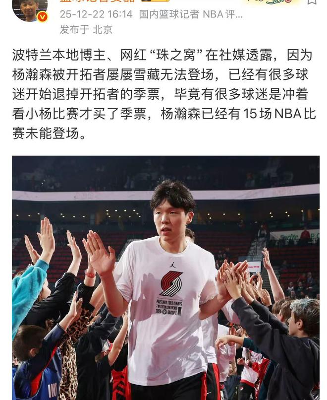 要知道很多当地的球迷就是为了看杨瀚森,所以才买了开拓者波特兰主场的门票,甚至花了上万块来买了整个赛季的门票。结果到现在整个赛季过去了3分之1,杨瀚森居然连续多场比赛被摁在替补席上。本身如果说教练组不打算让杨瀚森上场的话,安排他去发展联盟打球,球迷的情绪也许都不会生气。问题是现在主队既不让杨瀚森被下放到发展联盟去打球,提升手感,去磨练他的技能包,又不允许他在常规赛上场,这无疑大大遏制了杨瀚森的发展空间。