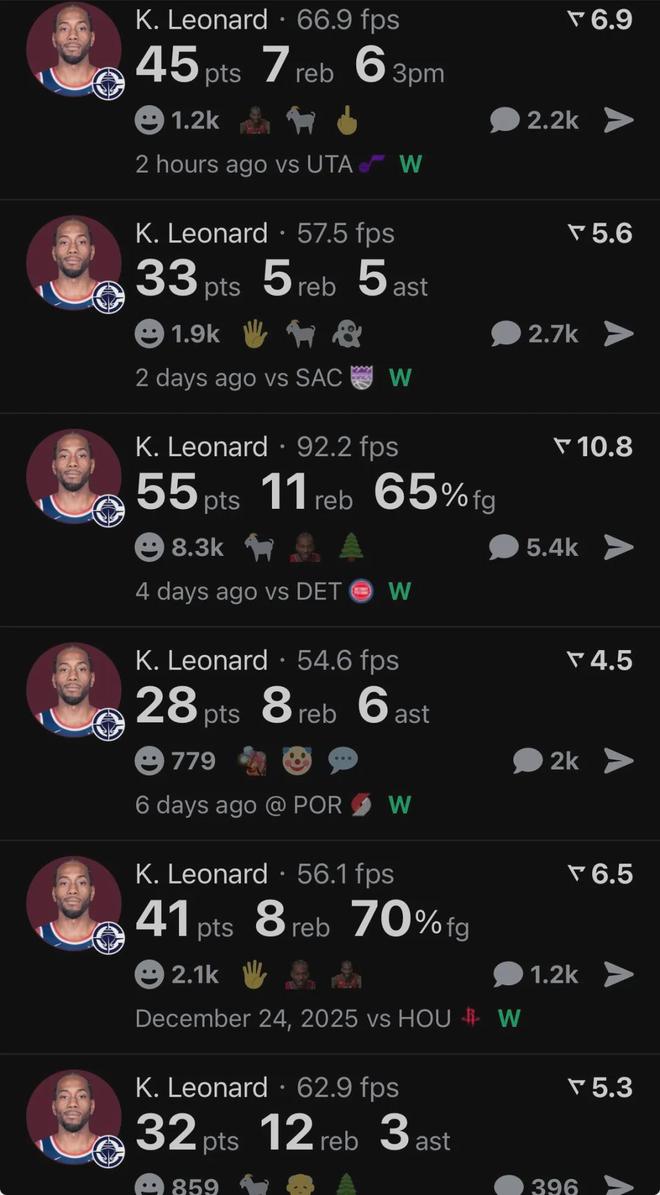 究竟还有谁能够阻挡他们?据统计,快船六连胜期间,累计赢了122分,场均狂胜对手20.3分......这六场比赛里,伦纳德场均爆砍39分,三项命中率53.2%、44.1%和93.5%,真实命中率高达69.5%,任