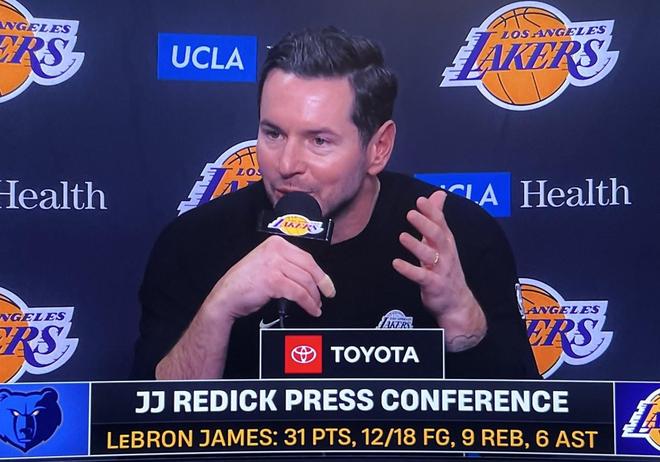 北京时间今日,在NBA常规赛中,洛杉矶湖人队在主场以128-121击败了孟菲斯灰熊队。赛后,湖人队主帅JJ-雷迪克接受了媒体采访。在被问到让东契奇持球同时让詹姆斯打无球,同时里夫斯