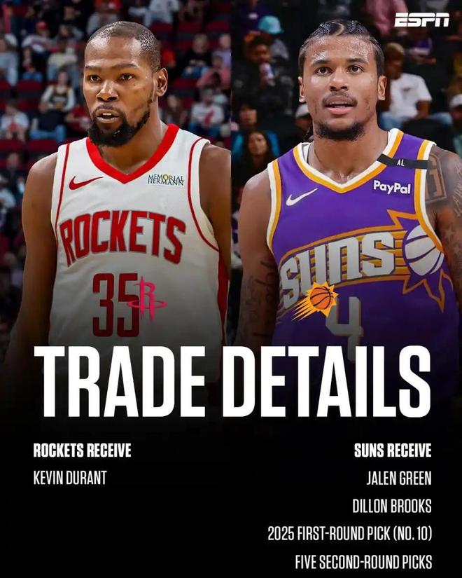 接着用一笔极度廉价的交易将杜兰特1换8送往火箭队,仅换回杰伦格林、狄龙、25年10号签,外加5个次轮签(25年火箭59号签、26年火箭的两个次轮签、30年凯尔特人的次轮签和32年火箭次轮签)。