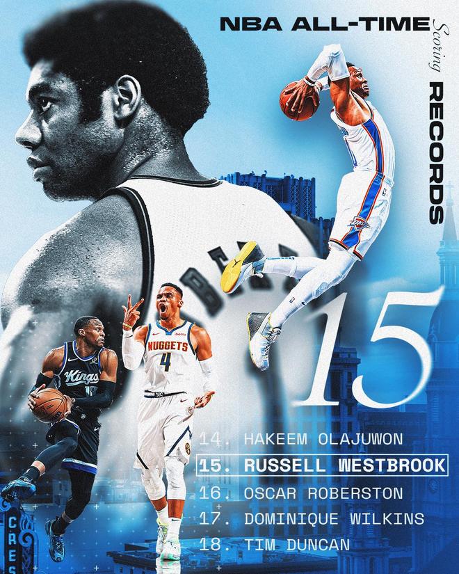 与此同时,威少生涯运动战进球数达到9615个,成功超越帕里什升至历史第19位。