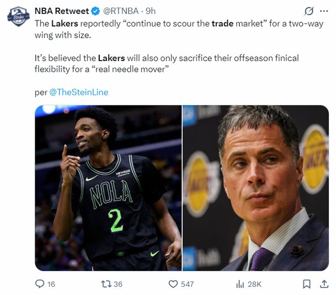 NBA名记马克-斯坦恩在最新的报道中透露,湖人继续在交易市场上寻找一位身材高大且攻防俱佳的侧翼球员。湖人只愿意为了这种攻防兼备的侧翼球员(真正能改变比赛局面的球员)而牺牲休赛期的财务灵活性/未来资产。