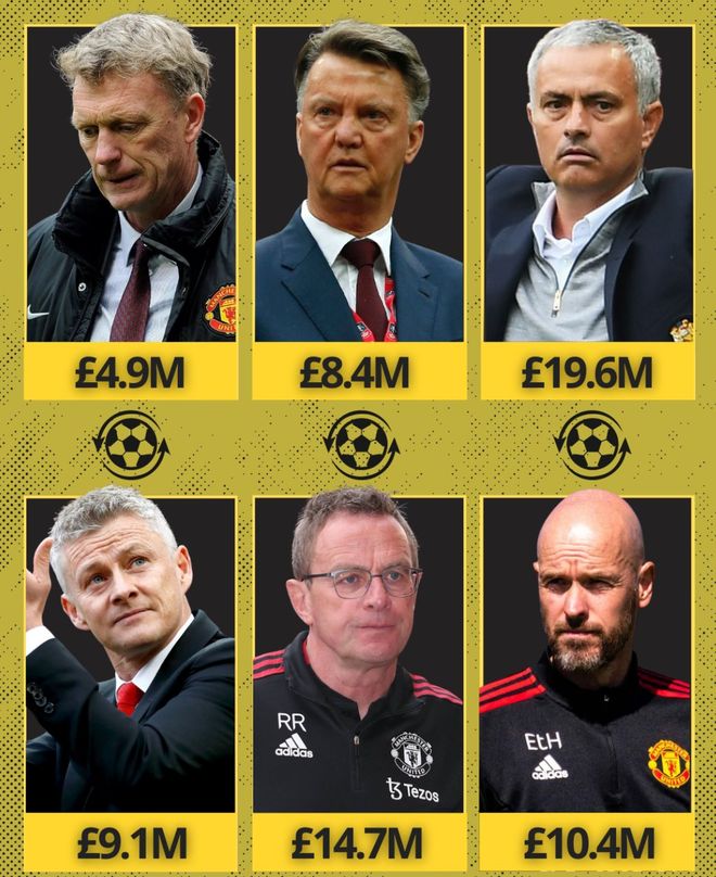 雷速体育10月3日宣 英国媒体The Athletic盘点了曼联从弗格森离开后至今,解雇六位教练的情况,总赔付金达到了5500万英镑!