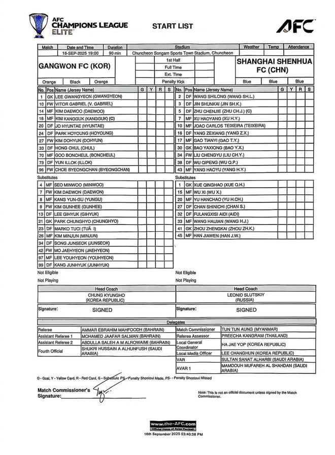 北京时间9月16日下午,亚冠精英联赛第一轮,上海申花将在客场对阵江原,赛前双方已经公布首发。