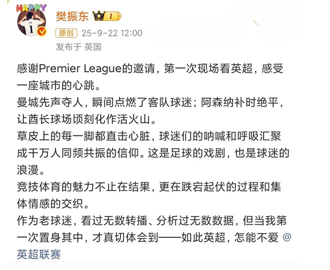 近日,奥运冠军樊振东在社媒发文,感谢了英超联赛。他受英超联赛的邀请,在酋长球场看了一场阿森纳与曼城的比赛。