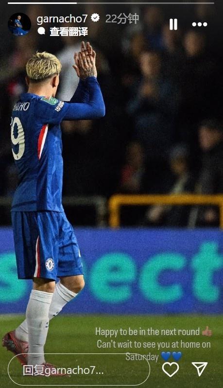 加纳乔写道:“很高兴晋级下一轮 迫不及待想在周六主场见到你们!”