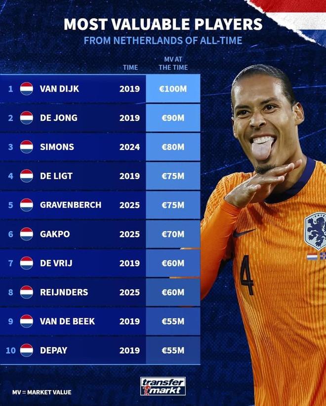 德转统计荷兰球员历史身价榜: