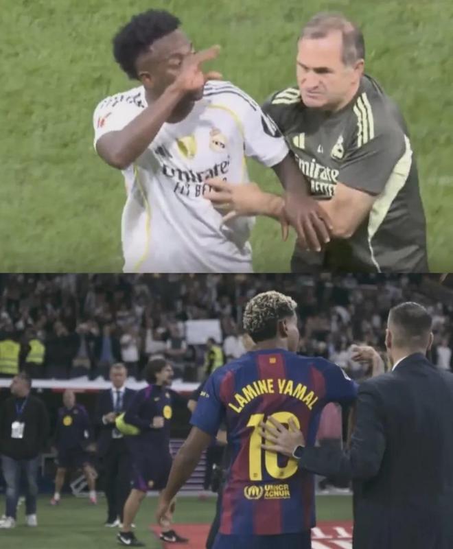 直到维尼修斯在回更衣室的路上和他迎面碰上,并做出一个嫌他话多的手势,亚马尔便约维尼修斯去更衣室“较量”,维尼修斯则边跑边回应并接受了挑战,但有人拦住了他。