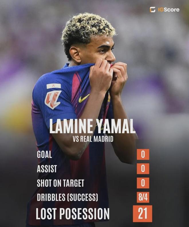 本场国家德比,亚马尔的表现可以说完全不如姆巴佩,他全场一共只有2次射门,0次射正,丢失球权达到了21次,是全场最高。