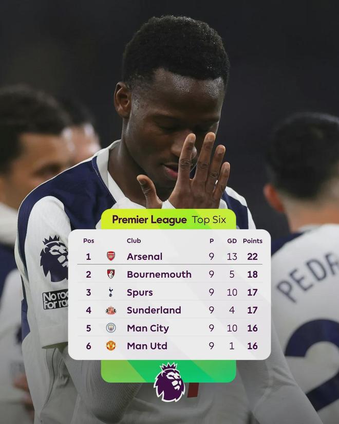 热刺、桑德兰排在第3、4位,曼市双雄同积16分,排在5、6位,利物浦15分,排名第7位。
