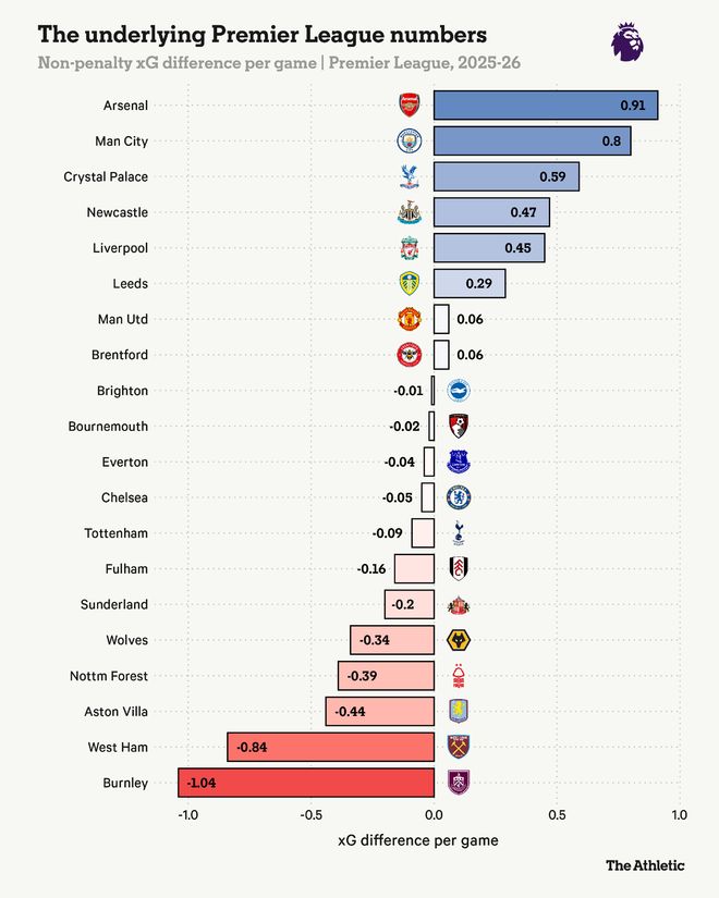 利兹联的三场胜利都是对阵目前排名倒数七名的球队,但他们的潜在数据提供了很多乐观的理由。他们在平均预期进球差(xG difference)中排名第六,这反映了他们持续强劲的表现,即使结果并不总是随之而来。如果他们保持这种水平,他们有很大机会保级成功。