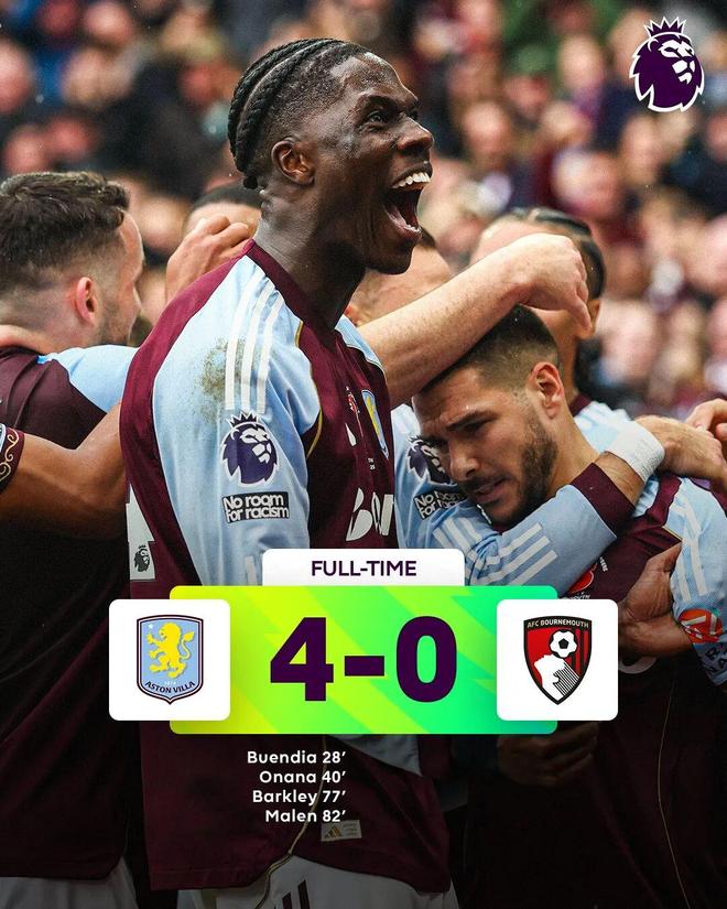 易边再战,塞门约主罚点球被大马丁扑出,随后,巴克利、马伦先后取得进球。最终,维拉4-0大胜伯恩茅斯。