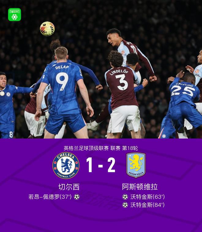 北京时间12月28日英格兰足球顶级联赛 联赛 第18轮,切尔西主场对阵阿斯顿维拉。切尔西若昂-佩德罗破门。阿斯顿维拉沃特金斯梅开二度。最终比分切尔西 1-2 阿斯顿维拉。关键事