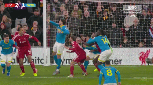 77分钟,利物浦反击丢球后前场有4名进攻球员无法及时回防,狼队利用这个机会快速反击,在禁区前从容拿球、分球,边路传中后头球攻门。