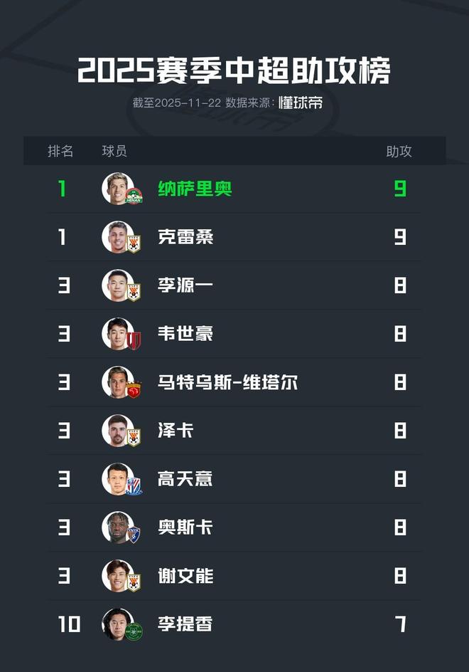 2025中超助攻榜:纳萨里奥、克雷桑9次并列第一,韦世豪8次